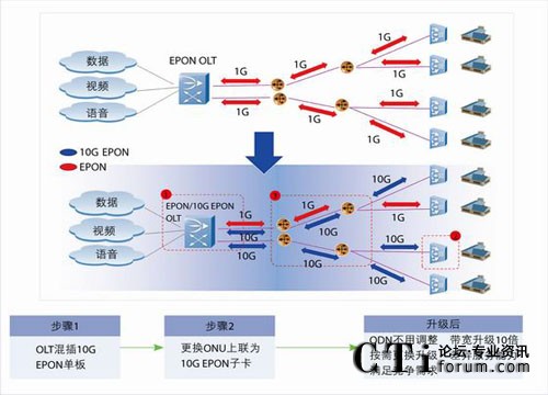 項目選取的試點小區(qū)建設(shè)于2006年,原來規(guī)劃的是每用戶6M帶寬。后期小區(qū)實裝率高,實際用戶超過1500戶,IPTV業(yè)務(wù)申請量提升后,出現(xiàn)了高峰時段IPTV點播業(yè)務(wù)不流暢、同時應(yīng)用IPTV和上網(wǎng)業(yè)務(wù)時網(wǎng)速過慢等問題。而且當湖北電信新推出10M~20M的新寬帶套餐時,該小區(qū)用戶申請新套餐數(shù)量受限。該小區(qū)的寬帶接入網(wǎng)絡(luò)已經(jīng)明顯無法滿足用戶日益增長的需求,寬帶提速正當其時。選擇10G EPON,能夠簡單兩步,將小區(qū)接入方式從EPON平滑升級為10G EPON,無需改變網(wǎng)絡(luò)結(jié)構(gòu),只需簡單升級設(shè)備(見圖)。