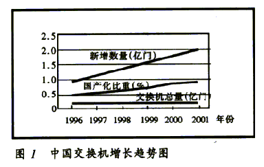 2000年,中國公用通信網(wǎng)上局用程控交換機的總容量達到1.79億門,國內生產設備的比重達80%。預計2001年新增交換機容量2100萬門,總容量達到2億門,國內生產設備的比重超過85%,增長趨勢見圖1。