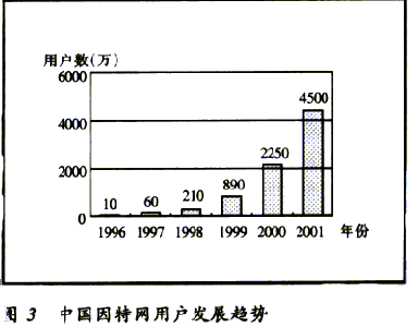 據(jù)CNNIC統(tǒng)計的數(shù)據(jù)表明,到2000年12月31日止,中國的因特網(wǎng)用戶達到2250萬戶,上網(wǎng)計算機892萬臺,預計2001年中國將有超過4500萬的網(wǎng)民。中國域名總數(shù)為12.2萬個,WWW站點數(shù)26.54萬個。中國因特網(wǎng)的發(fā)展速度驚人,與國際因特網(wǎng)的發(fā)展速度相當。中國因特網(wǎng)用戶發(fā)展趨勢見圖3。