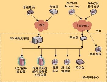 NBX網(wǎng)絡(luò)呼叫中心的核心是3Com公司的NBX網(wǎng)絡(luò)電話交換機(jī),它具有PBX的功能,支持多種外線接入方式,呼入的語音信號轉(zhuǎn)換為數(shù)據(jù)包,在局域網(wǎng)內(nèi)部傳輸,實(shí)現(xiàn)局域網(wǎng)內(nèi)部語音、數(shù)據(jù)的統(tǒng)一。坐席可以延伸到數(shù)據(jù)網(wǎng)可以達(dá)到的地方(適當(dāng)?shù)膸挘皇艿乩砦恢玫南拗。你可以通過申請各類專線,如VPN、DDN等,將計(jì)算機(jī)連入呼叫中心,實(shí)現(xiàn)分地域、分種類、分?jǐn)?shù)據(jù)的服務(wù)。NBX網(wǎng)絡(luò)呼叫中心擴(kuò)大了對外服務(wù)方式,通過上網(wǎng)訪問企業(yè)主頁,并使用Windows集成的Netmeeting軟件通過使用電腦的聲卡、耳機(jī)、麥克風(fēng)直接與服務(wù)代理人員進(jìn)行語音交流。