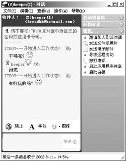 聊天功能是IM軟件最基本、也是最重要的功能,基本上每一種IM軟件在這個(gè)功能上的操作都差不多:如果用戶(hù)想與聯(lián)系人進(jìn)行聊天,可以雙擊IM中聯(lián)系人的頭像,在彈出的對(duì)話框中敲入文字信息發(fā)送即可。QQ的特點(diǎn)是可以給不在線的朋友發(fā)送信息,對(duì)方下次上線的時(shí)候可以收到,MSN雖然不具備這樣的功能,但是它在聊天過(guò)程中可以使用各種漂亮的表情圖標(biāo)為聊天添加了不少情趣。