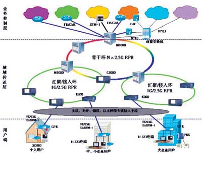 絡(luò)明網(wǎng)絡(luò)的RPR解決方案是將RPR技術(shù)、MPLS技術(shù)、時鐘同步技術(shù)、CWDM技術(shù)和電視視頻廣播技術(shù)結(jié)合在一起而提供的面向IP優(yōu)化,并同時支持TDM業(yè)務(wù)的寬帶多業(yè)務(wù)解決方案。Luminous RPR解決方案的網(wǎng)絡(luò)拓撲結(jié)構(gòu)如左圖所示。