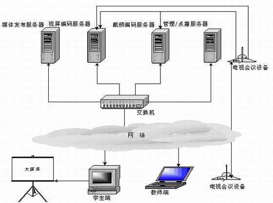 當老師端在異地時(攝像頭離服務(wù)器較遠,無法物理連接),可通過“電視會議系統(tǒng)”將老師的圖像及聲音實時傳送到編碼服務(wù)器,桌面課件可以通過PcAnywhere傳送到編碼服務(wù)器。圖像,聲音和桌面課件通過Web Streaming采集壓縮并在網(wǎng)上實時廣播。這種系統(tǒng)架構(gòu)也是當今功能比較齊全和完善的一種實現(xiàn)方式。