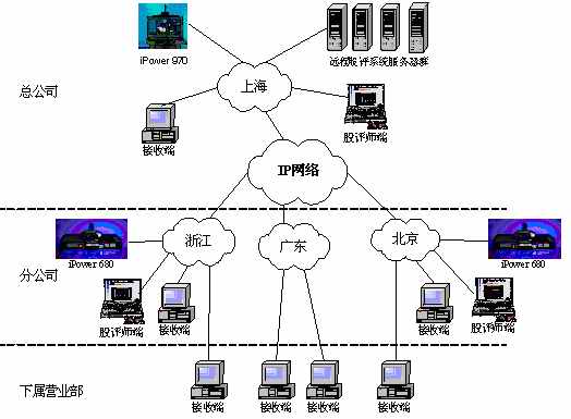 某證券公司有三級網(wǎng)絡(luò),總公司、分公司和下屬營業(yè)部?偣镜椒止編捠2M,在總公司配置一套會議室型電視會議終端POLYCOM 970和一套多點會議服務(wù)器Radvision ViaIP400。在分公司配置了38套會議室型電視會議終端POLYCOM 680,用于與總公司進行雙向視頻會議。分公司到營業(yè)部帶寬是512K,各營業(yè)部安裝遠程股評系統(tǒng)接收端程序,遠程股評系統(tǒng)服務(wù)器都放置在海通總公司。當在總公司進行股評時,總公司本地攝像頭拍攝教師畫面,MIC采集教師聲音,傳給服務(wù)器編碼,再通過網(wǎng)絡(luò)供各個接收端接收;當在分公司進行股評時,首先分公司的電視會議設(shè)備采集教師畫面及聲音傳回總公司的電視會議設(shè)備,再傳給遠程股評系統(tǒng)的服務(wù)器進行編碼,然后通過網(wǎng)絡(luò)發(fā)布,供接收端接收。(結(jié)構(gòu)如下圖)
