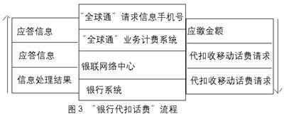 “銀行代扣話費”方式 對于“由非銀行端發(fā)起,但需銀行代扣收的交易”,其執(zhí)行通過多種接入方式(如手機短消息、GPRS、客戶服務(wù)中心、自助終端、因特網(wǎng)等)提交信息,內(nèi)容包括“全球通”手機號、“神州行”手機號、IP電話卡號、付費金額、銀行賬戶、密碼、交易類型等。