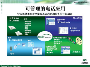 Sonus IP CENTREX解決方案主要基于可管理的語(yǔ)音數(shù)據(jù)綜合寬帶接入網(wǎng);能夠提供話音業(yè)務(wù)的應(yīng)用交換機(jī);能夠提供桌面話音業(yè)務(wù)的IP