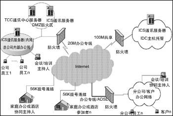 在實際建立的系統(tǒng)中,采用了公司內(nèi)部3臺服務(wù)器。一臺ICC主要用作登錄認證及用戶和服務(wù)器管理;2臺ICS服務(wù)器,一臺布置在防火區(qū),供外網(wǎng)用戶的訪問,一臺在內(nèi)網(wǎng),供公司內(nèi)部員工使用。在公司外面,托管了一臺ICS(通訊服務(wù)器),供公司外部用戶訪問。
