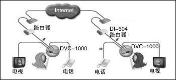 Modem上。圖1通過DI-604路由器與DSL Modem連接,實現與Internet互聯。DVC-1000還配備了一個電話機接口,可以外接一部普通電話機作為話音交流和撥號設備。
