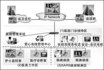 在安裝過程中,醫(yī)院通過原有的網絡系統就可完成視頻系統的搭建,該系統可應用于隔離區(qū)、護士監(jiān)控室、會議室、醫(yī)療診斷室、住院部等地方。每個房間只要安裝一臺DVC-1000,同時配備電視機或投影機等視音頻播放設備,通過上面所述的安裝程序,就可以搭建一套互動式的視頻系統,這樣醫(yī)護人員只要在監(jiān)控室就可以隨時觀察隔離區(qū)的病人(如圖2所示)。