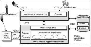 ·移動應(yīng)用系統(tǒng)(MAS)。幾乎所有的移動應(yīng)用都由MAS完成。MAS最主要的接口是與不同移動運營商網(wǎng)關(guān)的連接,被定義為網(wǎng)關(guān)適配器(Adapter