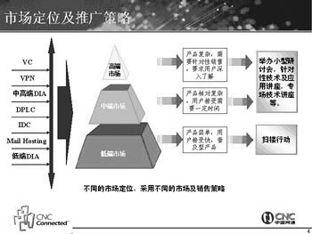 為了打開網(wǎng)通視訊業(yè)務(wù)的局面,網(wǎng)通的推廣方案也非常完備,這位負(fù)責(zé)人向記者出示了一張圖(見左下圖),詳細(xì)地解釋了網(wǎng)通視訊業(yè)務(wù)的市場(chǎng)定位及推廣策略。首先是通過媒體宣傳給客戶以整體印象,力求覆蓋面廣,眾所周知; 接著以直郵形式有針對(duì)性地發(fā)放詳細(xì)單頁(yè)資料,深入宣傳;然后以小型研討會(huì)、技術(shù)講座等形式,有針對(duì)性地召集當(dāng)?shù)啬繕?biāo)客戶/潛在用戶,細(xì)論VC市場(chǎng)及產(chǎn)品; 最后是以巡展、樣板客戶案例造聲勢(shì),提高產(chǎn)品形象。