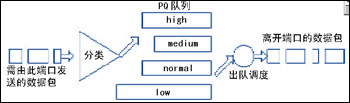 為了實現(xiàn)QoS,需要改變傳統(tǒng)IP網(wǎng)絡(luò)的FIFO隊列傳輸報文機(jī)制,轉(zhuǎn)而采用優(yōu)先級隊列(Priority Queueing, PQ)機(jī)制,見圖2。