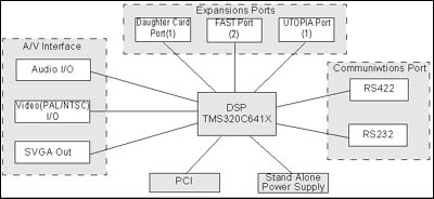 ATEME公司開(kāi)發(fā)的NVDK板,基于TI公司的TMS320C64系列DSP,板上DSP為T(mén)MS320C6415或TMS320C6416,工作頻率600MHz。體系結(jié)構(gòu)圖如左: