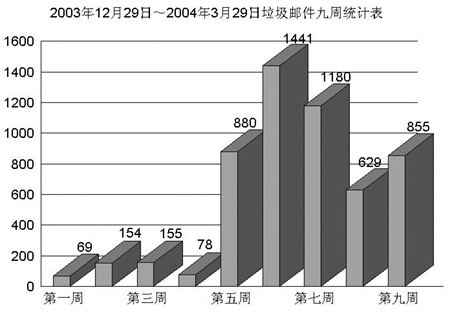 出于為反垃圾郵件產(chǎn)品評(píng)測(cè)積累樣本的目的,記者于2003年12月在“計(jì)算機(jī)世界網(wǎng)”上張貼了一個(gè)誘餌信箱,令人吃驚的是,僅僅在誘餌信箱發(fā)布后不到5分鐘,第一封垃圾郵件就不期而至。自從該誘餌信箱發(fā)布以來(lái),其垃圾郵件的數(shù)量增長(zhǎng)情況如上圖所示。