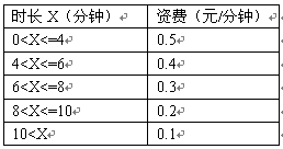 例3,國內(nèi)長途話費(fèi)在時(shí)長不超過4分鐘的情況下,按0.07元/6秒收;超過4分鐘但不超過6分鐘,統(tǒng)一按0.06元/6秒收;超過6分鐘但不超過8分鐘,統(tǒng)一按0.05元/6秒收取;超過8分鐘但不超過10分鐘,統(tǒng)一按0.04元/6秒收。怀^10分鐘,統(tǒng)一按0.03元/6秒收取。