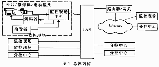 遠(yuǎn)程監(jiān)控系統(tǒng)一般包括三部分:前端監(jiān)控現(xiàn)場、通信設(shè)備和后端分控中心。整個系統(tǒng)基于Client/Server(客戶機(jī)/服務(wù)器)模式?傮w結(jié)構(gòu)如圖1所示。