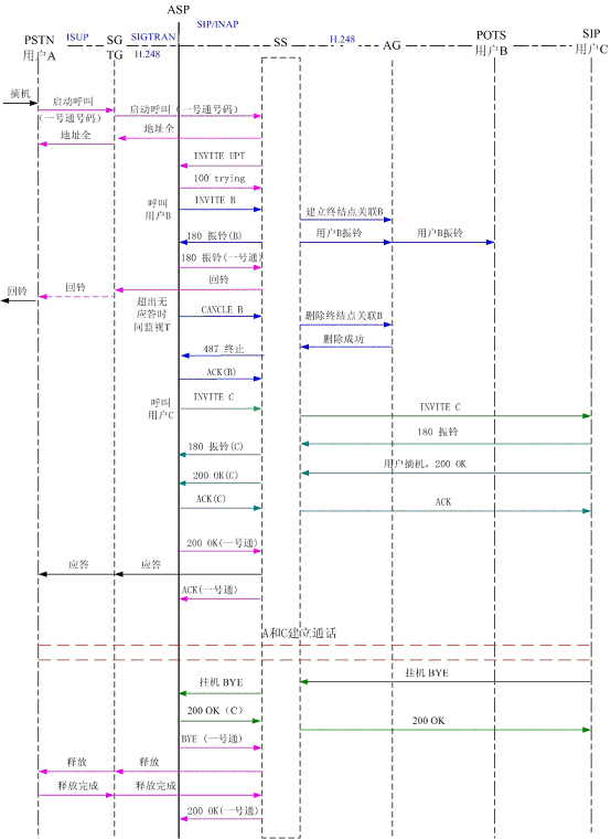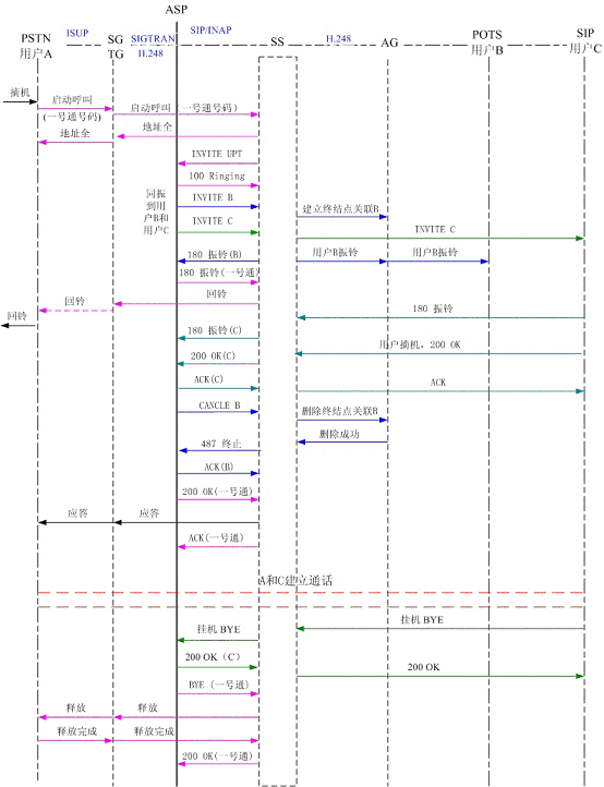 圖5為PSTN用戶A撥打一號通用戶,順呼軟交換域AG下POTS用戶B和SIP用戶C,其中軟交換和應(yīng)用服務(wù)器以SIP協(xié)議相連,軟交換和AG、軟交換和TG以H.248協(xié)議相連?梢钥吹,用戶B首先振鈴,振鈴達(dá)到規(guī)定時間后,應(yīng)用服務(wù)器取消了對用戶B的振鈴,轉(zhuǎn)而對用戶C振鈴。用戶C摘機(jī)應(yīng)答,通話結(jié)束,用戶C掛機(jī),系統(tǒng)釋放了呼叫。