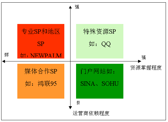 通過提供網(wǎng)絡服務產生強大流量帶動無線業(yè)務發(fā)展,業(yè)務收入主要來源網(wǎng)站推廣,產品常圍繞自有網(wǎng)絡內容策劃、主要收入來自圖鈴、社區(qū)等網(wǎng)絡特點鮮明的業(yè)務:搜狐、新浪、網(wǎng)易、TOM;