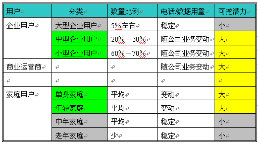從以上表格可以清楚的顯示中小企業(yè)、商業(yè)運營商、年青用戶對電話和數(shù)據的使用不穩(wěn)定,這就意味者可發(fā)展、擴大使用的可能性非常大,是企業(yè)增加收入的潛在用戶,但最主要的是如何提高這些用戶的使用呢?經濟規(guī)律告訴我們如果你提供的商品對用戶有用,同時價廉、物美,用戶是不會拒絕的。對于電話運營商來講就是提供給企業(yè)帶來方便、效率、節(jié)省成本、方便管理的服務的同時,提高有效接通率。
