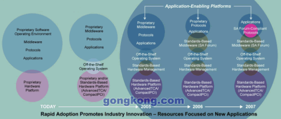 計(jì)算機(jī)和通信業(yè)已經(jīng)堅(jiān)定的向開放標(biāo)準(zhǔn)演進(jìn)。例如,Linux已經(jīng)被作為OS大量采用,計(jì)算模塊已經(jīng)遵循各種規(guī)范標(biāo)準(zhǔn)來設(shè)計(jì),具有標(biāo)準(zhǔn)接口,如CPCI和ATCA。如果TEM繼續(xù)采用目前的方法集成計(jì)算機(jī)硬件和軟件模塊,全面標(biāo)準(zhǔn)化將是一個(gè)緩慢延進(jìn)的過程。下一步將是基于標(biāo)準(zhǔn)的硬件平臺(tái)管理,最終可能在本年代末,遵循SAF的中間件及其上運(yùn)行的應(yīng)用。