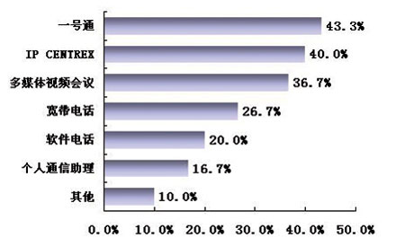 CENTREX感興趣的用戶為40.0%,對(duì)多媒體視頻會(huì)議感興趣的用戶達(dá)到36.7%,對(duì)寬帶電話感興趣的用戶達(dá)到26.7%。