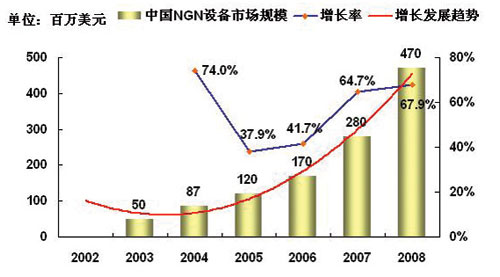 2005年全球?qū)τ贜GN的基礎(chǔ)實(shí)施的建設(shè)將會(huì)進(jìn)入快速啟動(dòng)期,而2005年以后中國的NGN的市場將進(jìn)入黃金發(fā)展時(shí)期。