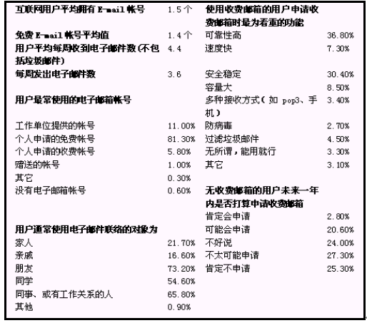 根據(jù)中國互聯(lián)網(wǎng)信息中心的調查顯示,中國現(xiàn)有9400萬互聯(lián)網(wǎng)用戶, 用戶最經(jīng)常使用的網(wǎng)絡服務和功能是電子郵箱:占85.6%。