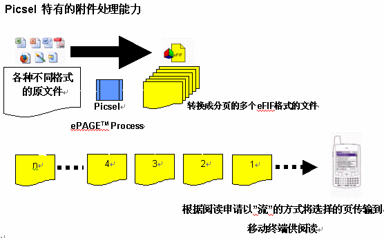 在計算機上的電子郵件的各種格式文件附件無需任何特殊處理、無需同步和轉換可以在移動終端上閱讀。并且電子郵件的附件可以被進一步壓縮使其通過網(wǎng)絡下載更為經(jīng)濟,壓縮后服務器將文件以"流"傳送,這意味著用戶無需等待一個多頁的文件完全下載完畢后再閱讀,可以選擇任何一頁下載閱讀。