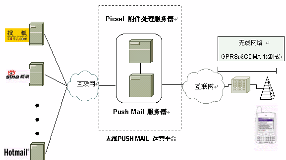 對于擁有便攜式計算機的用戶,在移動中,通過對其計算機進行相應的軟、硬件的配置,根據(jù)其所在地的可利用的資源,可以開啟便攜式計算機借助于GPRS、CDMA1x、WiFi無線或有線寬帶和撥號等手段上網(wǎng)訪問其EMAIL。而在沒有便攜式計算機或計算機關閉的情況下,PUSH MAIL系統(tǒng)可以在GPRS和CDMA1x廣泛的覆蓋范圍內主動地將您的EMAIL"推"送到您的手機上,手機在接收到EMAIL后會發(fā)出提示音,使用戶可以在第一時間及時地閱讀到您的EMAIL及其附件。