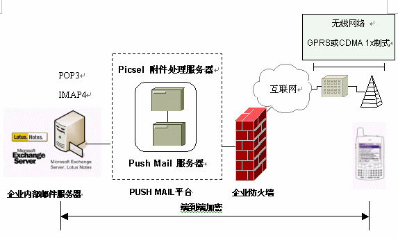 企業(yè)在其內部放火墻內安裝PUSH MAIL平臺,并在移動終端上安裝相應的PUSH MAIL客戶端軟件,可以將企業(yè)郵箱用戶現(xiàn)有的EMAIL帳號延伸到手機上,不改變用戶的使用習慣,可以瀏覽郵件的附件。采用端到端的加密措施,確保郵件的安全性。