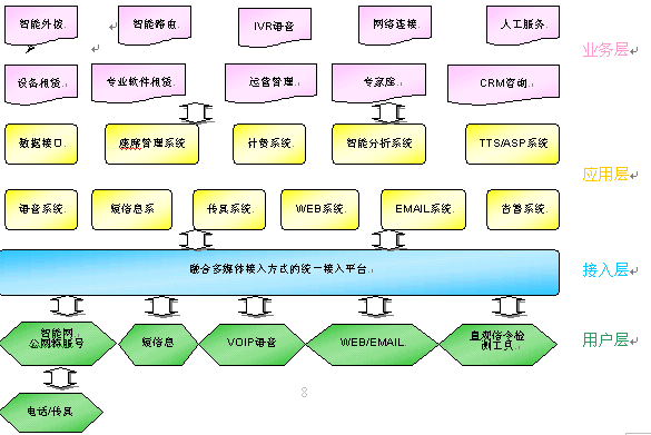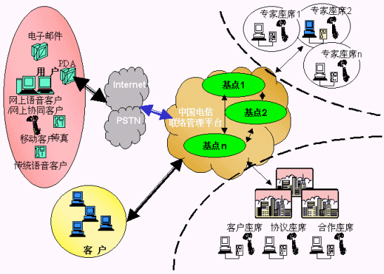 電信運營商提供的用戶、客戶、電信公司的統(tǒng)一的聯(lián)系平臺,各類客戶通過使用聯(lián)系平臺,向其用戶提供方便的、不受時間、地域和媒體的限制的"3A"級聯(lián)絡服務,用戶、客戶、電信平臺間的聯(lián)絡能得到有效路由、管理、品質保障;聯(lián)絡中心通過將分布在各地、各種媒體、各種形式的資源整合在一起實現(xiàn)客戶服務增值,創(chuàng)造無限商機,有效提升客戶聯(lián)絡中心的價值,使用戶得到最貼身的、個性化的、專業(yè)的服務,為客戶提供成本更低、資源更豐富、服務更專業(yè)、具備強大商業(yè)智能的產品營銷及服務、電信運營商則開發(fā)大量的增值服務、產生更多的利潤增長空間、更多忠實的客戶,實現(xiàn)三方面共同成功。