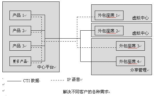 外包中心應既能服務本地業(yè)務,同時服務本區(qū)甚至全球業(yè)務,單點互連接主要為降低服務成本,共享服務資源。單點中心應具備靈活的組網(wǎng)方式,可管理客戶現(xiàn)有平臺,并具備高質量座席向客戶提供高質量的高端服務,同時又有解決普通客戶服務的一般座席,向客戶提供低價位的公眾服務,如下圖示意: