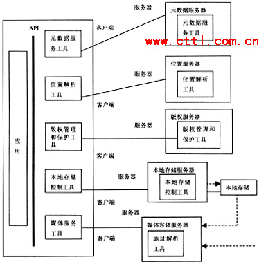 在DAVIC1.5AnytimeAnywhere文件中所規(guī)定的模型如圖2所示。在該圖中沒有描述任何與網(wǎng)絡(luò)相關(guān)的內(nèi)容。僅規(guī)定出在客戶端設(shè)備和服務(wù)器端設(shè)備中應(yīng)當(dāng)包含的功能模塊。即:元數(shù)據(jù)服務(wù)、位置解析、版權(quán)管理和保護(hù)、本地存儲控制、媒體服務(wù)。其基本思想為,在服務(wù)器端提供的所有功能。在客戶端設(shè)備中應(yīng)包含有相關(guān)的軟件工具。在業(yè)務(wù)的具體實(shí)施過程中,客戶端首先向服務(wù)器端請求幫助查找其感興趣的媒體內(nèi)容,由元數(shù)據(jù)服務(wù)器處理并返回相關(guān)信息。通過位置解析服務(wù)器來確定客戶端所選擇的媒體內(nèi)容所在的位置;經(jīng)過媒體管理和保護(hù)服務(wù)器的認(rèn)可:由本地存儲服務(wù)器向用戶提供媒體信息同時(shí)允許客戶端對媒體信息進(jìn)行控制。