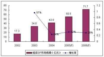 繼2004年中國政府和運營商監(jiān)管力度的加大,2005年的短信SP市場規(guī)模增長率為32%,SP市場規(guī)模55.5億元,比2004年略有上升;谀壳岸绦攀袌鲈隽渴袌龅目s小,其增長主要依靠對存量市場需求的深度挖掘。諾盛預計2006年的短信市場繼續(xù)保持平穩(wěn)的增長勢頭,增長率將達29%。