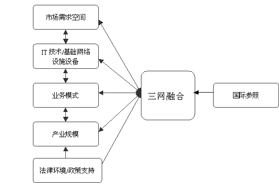 三網(wǎng)融合,需要巨大的市場需求空間、成熟的IT技術/基礎設施、適宜的業(yè)務模式、可觀的產(chǎn)業(yè)規(guī)模以及良好的政策支持和法律環(huán)境等必備條件的出現(xiàn)。