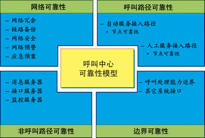 根據(jù)多年的實(shí)踐經(jīng)驗(yàn),對(duì)電信級(jí)呼叫中心提出如下高可靠性分析模型,如圖1所示。該模型將電信級(jí)呼叫中心可靠性分析分為四個(gè)維度:網(wǎng)絡(luò)可靠性、呼叫路徑可靠性、邊界可靠性、非呼叫路徑可靠性。