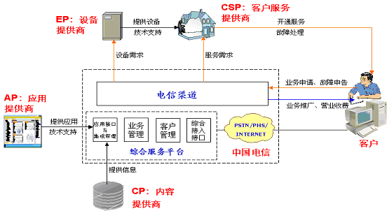 商務(wù)領(lǐng)航業(yè)務(wù)由中國電信和AP(應(yīng)用提供商)、EP(設(shè)備提供商)、CSP(客戶服務(wù)提供商)、CP(內(nèi)容提供商)合作運營。合作伙伴的分工和服務(wù)流程如下圖所示。
