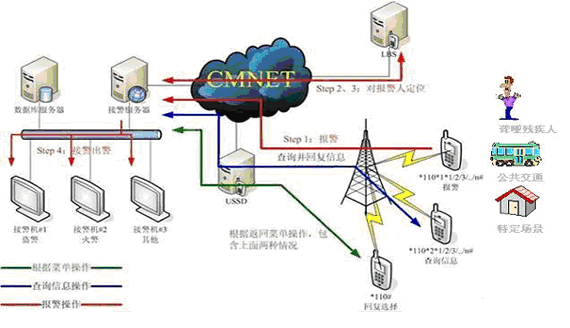 《移動定位快信報警系統(tǒng)》是公眾的報警短消息是通過手機撥打“*110#”,經(jīng)過USSD移動快信平臺和移動位置信息服務(LBS)平臺,報警信息數(shù)據(jù)和報警位置的經(jīng)緯度數(shù)據(jù)信息傳送到110指揮中心系統(tǒng)中,110值班干警通過網(wǎng)絡終端,根據(jù)報警內(nèi)容和報警人位置信息(電子地圖顯示)等數(shù)據(jù)進行處警,特別情況可以直接撥打電話或通過短信(SMS)交互平臺,進一步與報警當事人進行短信交互。