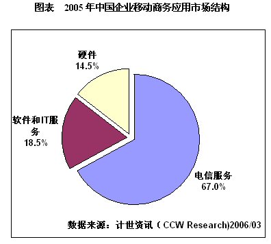 目前,我國移動(dòng)商務(wù)市場仍處于萌芽期,根據(jù)計(jì)世資訊(CCW Research)《2005-2006中國移動(dòng)商務(wù)應(yīng)用發(fā)展趨勢研究報(bào)告》數(shù)據(jù),2005年中國企業(yè)移動(dòng)商務(wù)應(yīng)用市場規(guī)模為112.5億元,其中硬件投資為16.3億元,軟件與IT服務(wù)投資為20.8億元,電信服務(wù)投資達(dá)到75.4億元,占有整體市場的67.0%。