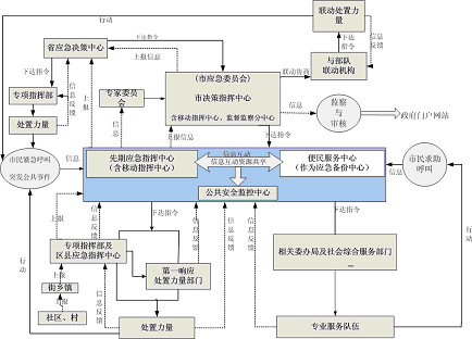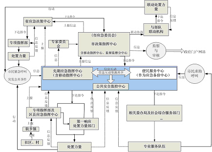 指政府決策指揮中心、先期指揮中心、便民服務(wù)中心、公共安全監(jiān)控中心,通常還有移動指揮中心和災(zāi)備中心,以及其它節(jié)點(diǎn)的建設(shè)。一般地,先期指揮中心與便民服務(wù)中心可互為備份。政府決策指揮中心對重大、特別重大突發(fā)公共事件進(jìn)行協(xié)調(diào)、決策,偏重于自然災(zāi)害與生產(chǎn)安全方面,而一般、較重突發(fā)公共事件仍保持由各專業(yè)指揮部指揮、處置,只有當(dāng)跨區(qū)、跨機(jī)構(gòu)需要協(xié)調(diào)時由政府決策指揮中心進(jìn)行協(xié)調(diào)。
