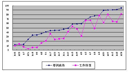我們通過分析,圖3顯示,員工的培訓(xùn)成績和其工作績效是無關(guān)的,這說明培訓(xùn)是無效的。無效的原因也許是由于培訓(xùn)內(nèi)容不合理或培訓(xùn)組織實施不善等原因,總之培訓(xùn)是無效的,需要改進(jìn)。