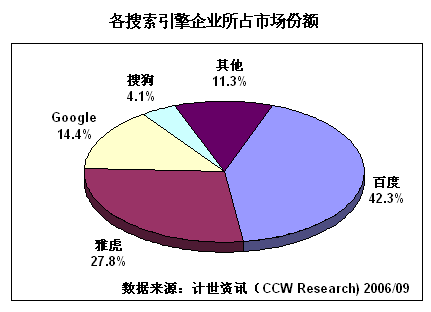 互聯(lián)網(wǎng)上的信息浩如煙海,是典型的信息爆炸,因此絕大多數(shù)網(wǎng)民都必須依靠搜索引擎才能找到所需信息,這個(gè)龐大的需求也就注定了搜索引擎市場的興旺繁榮。計(jì)世資訊(CCW Research)數(shù)據(jù)顯示:2004年中國的搜索引擎市場銷售總額達(dá)到9.4億元人民幣,增長67.9%,2005年繼續(xù)保持47.9%的增長速度,達(dá)到13.9億元,到2006年預(yù)計(jì)這個(gè)數(shù)字將突破20億元大關(guān)。