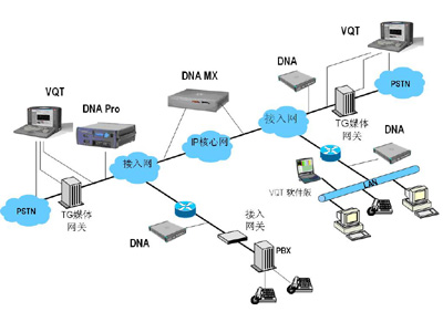 以上兩種測(cè)試方法也可以結(jié)合使用,在進(jìn)行端到端VQT測(cè)試時(shí),在NGN網(wǎng)絡(luò)的中間網(wǎng)段(根據(jù)需要可以設(shè)置多個(gè)監(jiān)測(cè)點(diǎn))部署分布式網(wǎng)絡(luò)分析儀(DNA),進(jìn)行被動(dòng)式RTP/RTCP監(jiān)測(cè),從而判斷出造成語音質(zhì)量下降的環(huán)節(jié)所在。如下圖所示: