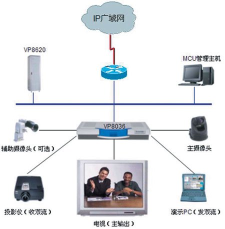 一般我們建議在電視會(huì)議室配置兩臺(tái)帶S-Video端子或者復(fù)合端子的電視機(jī)或者背投,一臺(tái)用于顯示遠(yuǎn)端會(huì)場(chǎng)畫面,一臺(tái)用于顯示本端會(huì)場(chǎng)畫面。電視機(jī)尺寸可根據(jù)會(huì)場(chǎng)大小來選擇。另外我們還建議在會(huì)場(chǎng)布置一臺(tái)高分辨率投影儀,用于顯示雙流畫面(PC畫面)。