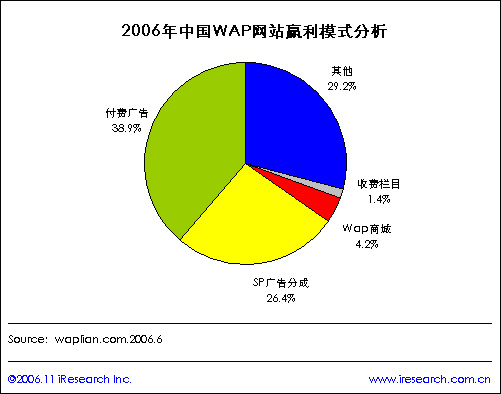 根據waplian.com統(tǒng)計數據顯示,2006年中國WAP網站贏利模式分析情況,付費廣告和SP廣告分成是WAP網站贏利模式的最主要兩種形式,比例分別為38.9%和26.4%,另外WAP商城和收費欄目的贏利模式也占一定份額比例,分別為4.2%和1.4%。