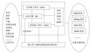 在電信集團(tuán)的統(tǒng)一規(guī)劃下,ISMP和SAG相繼推出。ISMP是綜合增值業(yè)務(wù)管理平臺,ISMP不但可以解決現(xiàn)網(wǎng)固網(wǎng)/PHS業(yè)務(wù)管理的問題,而且可以配合促進(jìn)3G業(yè)務(wù)試驗和體驗,不斷完善,進(jìn)行增值業(yè)務(wù)價值鏈、業(yè)務(wù)內(nèi)容合作,收集市場需求和完善的增值業(yè)務(wù)應(yīng)用模式,整合和強化現(xiàn)有的市場營銷環(huán)節(jié)。SAG是業(yè)務(wù)接入網(wǎng)關(guān),它包含與業(yè)務(wù)引擎的“業(yè)務(wù)能力驅(qū)動”接口,包含與ISMP的“SP/用戶管理”接口,包含對移動和固定網(wǎng)絡(luò)的支持。ISMP、SAG與業(yè)務(wù)平臺和周邊支撐系統(tǒng)的關(guān)系如圖7所示。
