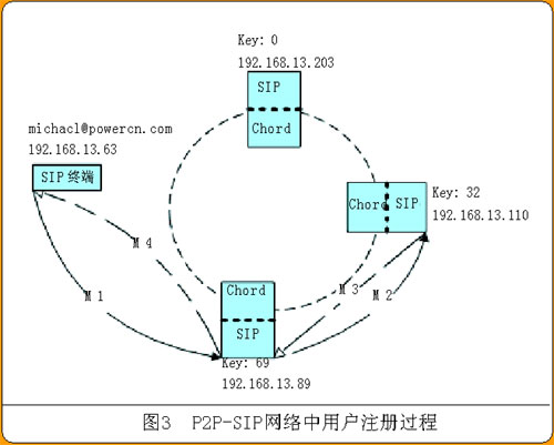 Key值為32的PN收到REGISTER請求后,取得請求中To頭域里的SIP URI(michael@powercn.com),調(diào)用find_responsible_pn(user)。返回值是192.168.13.110:5060,比較后發(fā)現(xiàn)是自己,說明自己負責(zé)管理該用戶,負責(zé)處理該用戶的注冊請求。之后的處理流程遵循SIP標準。假定注冊成功,PN返回200 OK應(yīng)答。如圖3中M3所示。應(yīng)答的返回遵循SIP標準,根據(jù)Via頭域按原路返回,不需要查找路徑,不會使用Chord層的操作。