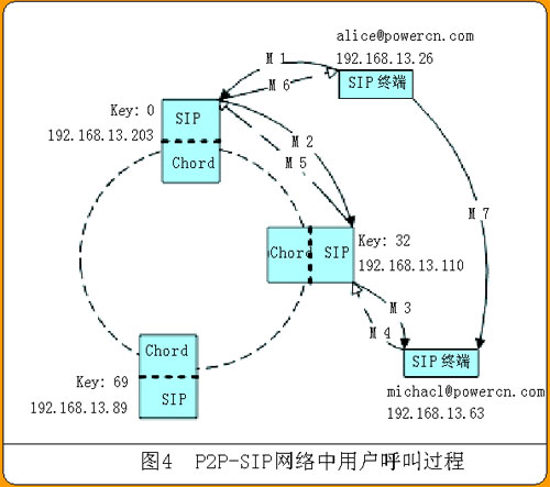 IP地址為192.168.13.26的用戶alice@powercn.com要呼叫用戶michael@powercn.com。alice可以把請求發(fā)給P2P-SIP網(wǎng)絡(luò)中任一PN?紤]到要在P2P-SIP網(wǎng)絡(luò)上提供增值業(yè)務(wù)(比如計費),alice把INVITE請求發(fā)給管理它的PN更合適一點,在本例中是IP為192.168.13.203,Key值為0的PN。如圖4中M1所示。