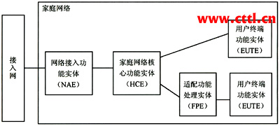 家庭網(wǎng)絡(luò)的參考模型如圖1所示。家庭網(wǎng)絡(luò)內(nèi)部的邏輯功能實(shí)體有4個,包括: