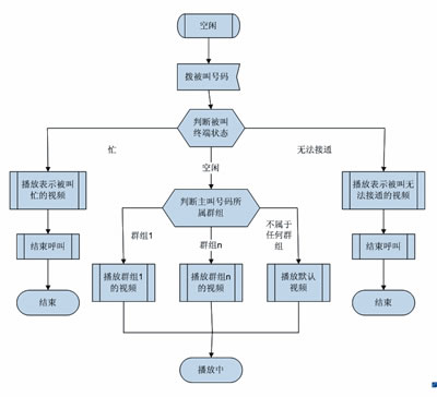 多媒體彩鈴用戶可以為某一位或某一組主叫用戶設(shè)定不同的視頻,當某個主叫用戶來電時,系統(tǒng)根據(jù)被叫用戶的狀態(tài)和主叫所屬的群組播放不同的視頻。如果被叫忙或者無法接通,則播放能表達被叫當前狀態(tài)的默認系統(tǒng)視頻;如果被叫空閑,則根據(jù)主叫號碼所屬的群組播放被叫為該群組定制的視頻。無論在哪種情況下,主叫都可以在手機上欣賞到精彩的視頻媒體。圖1是多媒體彩鈴業(yè)務使用流程。